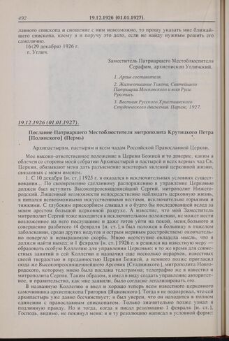 Послание Патриаршего Местоблюстителя митрополита Крутицкого Петра [Полянского] (Пермь). 19.12.1926 г. (01.01.1927) г.