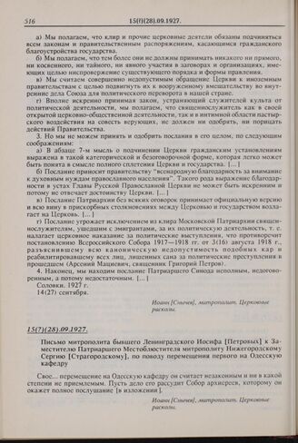 Письмо митрополита бывшего Ленинградского Иосифа [Петровых] к Заместителю Патриаршего Местоблюстителя митрополиту Нижегородскому Сергию [Страгородскому], по поводу перемещения первого на Одесскую кафедру. 15(?)(28).09.1927 г.