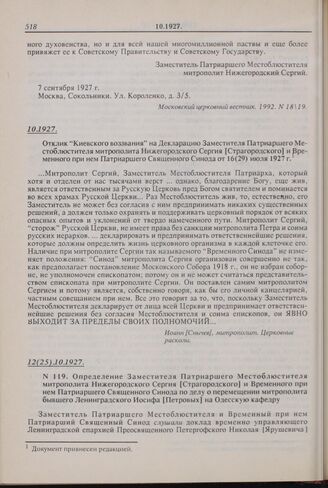Отклик «Киевского воззвания» на Декларацию Заместителя Патриаршего Местоблюстителя митрополита Нижегородского Сергия [Страгородского] и Временного при нем Патриаршего Священного Синода от 16(29) июля 1927 г. 10.1927 г.