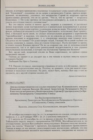 Доклад возвратившегося из ссылки епископа Спас-Клепиковского, викария Рязанской епархии Василия [Беляева] Заместителю Патриаршего Местоблюстителя митрополиту Нижегородскому Сергию [Страгородскому] и Временному Патриаршему Священному Синоду. 29.10(11.11).1927 г. // Архив составителя.; Елевферий [Богоявленский], митрополит. Неделя в Патриархии. Париж, 1933.; Иоанн [Снычев], митрополит. Церковные расколы.