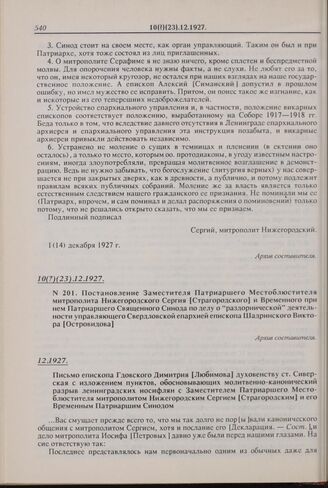 Письмо епископа Гдовского Димитрия [Любимова] духовенству ст. Сиверская с изложением пунктов, обосновывающих молитвенно-канонический разрыв ленинградских иосифлян с Заместителем Патриаршего Местоблюстителя митрополитом Нижегородским Сергием [Страгородским] и его Временным Патриаршим Синодом. 12.1927 г. // Иоанн [Снычев], митрополит. Церковные расколы.