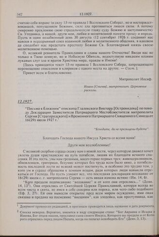 Письмо к ближним епископа Глазовского Виктора [Островидова] по поводу Декларации Заместителя Патриаршего Местоблюстителя митрополита Сергия [Страгородского] и Временного Патриаршего Священного Синода от 16(29) июля 1927 г. 12.1927 г. // Польский М., протопресвитер. Новые мученики российские. Джорданвилль, 1957. Т. 2.