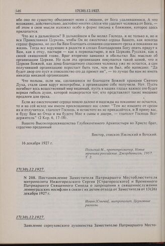Постановление Заместителя Патриаршего Местоблюстителя митрополита Нижегородского Сергия [Страгородского] и Временного Патриаршего Священного Синода о запрещении в священнослужении ленинградских иосифлян в связи с их актом отхода от Заместителя от 13(26) декабря 1927 г. № 208. 17(30).12.1927 г.