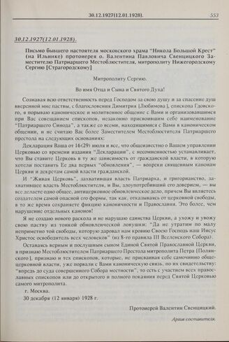 Письмо бывшего настоятеля московского храма «Никола Большой Крест» (на Ильинке) протоиерея о. Валентина Павловича Свенцицкого Заместителю Патриаршего Местоблюстителя, митрополиту Нижегородскому Сергию [Страгородскому]. 30.12.1927 г. (12.01.1928) г.