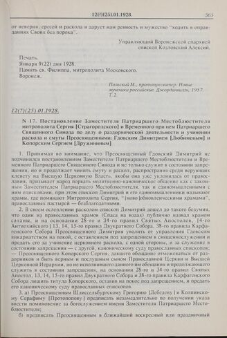 Постановление Заместителя Патриаршего Местоблюстителя митрополита Сергия [Страгородского] и Временного при нем Патриаршего Священного Синода по делу о раздорнической деятельности и учинении раскола и смуты Преосвященными: Гдовским Димитрием [Любимовым] и Копорским Сергием [Дружининым]. № 17. 12(?)(25).01.1928 г. // Иоанн [Снычев], митрополит. Церковные расколы.; Елевферий [Богоявленский], митрополит. Неделя в Патриархии. Париж, 1933.