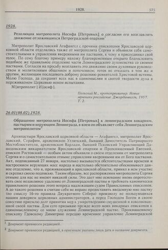 Резолюция митрополита Иосифа [Петровых] о согласии его возглавлять движение отложившихся Петроградской епархии. 1928 г. // Польский М., протопресвитер. Новые мученики российские. Джорданвиллъ, 1957. Т. 2.
