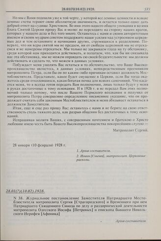 Журнальное постановление Заместителя Патриаршего Местоблюстителя митрополита Сергия [Страгородского] и Временного при нем Патриаршего Священного Синода по делу о раздорнической деятельности митрополита Одесского Иосифа [Петровых] и епископа бывшего Никольского Иерофея [Афоника]. № 38. 28.01(?)(10.02).1928 г.