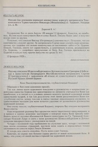 Письмо (на денежном переводе) неизвестному адресату митрополита Ташкентского и Туркестанского Никандра [Феноменова]. 02(15)(?).02.1928 г.