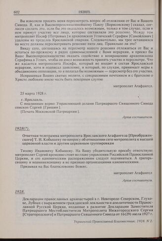 Декларации православных архипастырей в г. Новгороде-Северском, Глухове, Лубнах с выражением гражданской лояльности и аполитичности Православной Русской Церкви, изданные в развитие Декларации Заместителя Патриаршего Местоблюстителя Митрополита Нижегородского Сергия [Страгородского] и Патриаршего Священного Синода от 16(29) июля 1927 г. 1928 г. // Украинский Православный Благовестник. 1928. № 2.