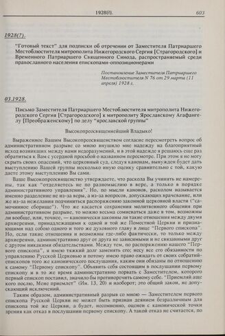Готовый текст для подписки об отречении от Заместителя Патриаршего Местоблюстителя митрополита Нижегородского Сергия [Страгородского] и Временного Патриаршего Священного Синода, распространяемый среди православного населения епископами-оппозиционерами. 1928 г. // Постановление Заместителя Патриаршего Местоблюстителя № 76 от 29 марта (11 апреля) 1928 г.