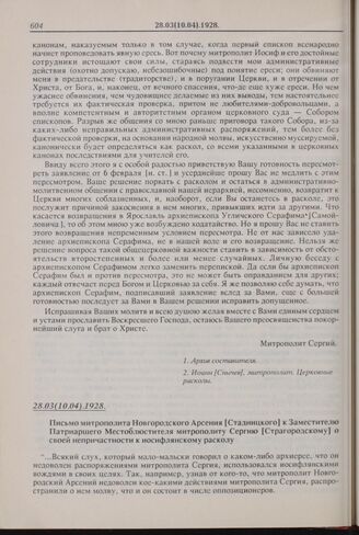 Письмо митрополита Новгородского Арсения [Стадницкого] к Заместителю Патриаршего Местоблюстителя митрополиту Сергию Страгородскому] о своей непричастности к иосифлянскому расколу. 28.03(10.04).1928 г.
