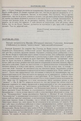 Письмо митрополита Иосифа [Петровых] епископу Гдовскому Димитрию [Любимову] по поводу капитуляции «ярославской оппозиции». 24.07(06.08).1928 г.