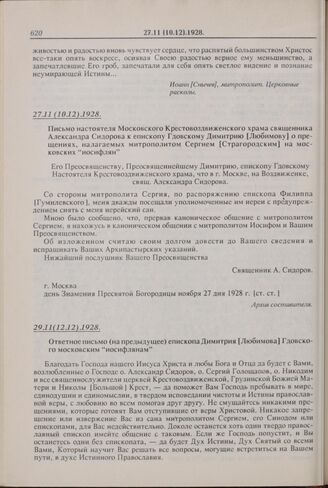 Письмо настоятеля Московского Крестовоздвиженского храма священника Александра Сидорова к епископу Гдовскому Димитрию [Любимову] о прещениях, налагаемых митрополитом Сергием [Страгородским] на московских «иосифлян». 27.11.(10.12).1928 г.