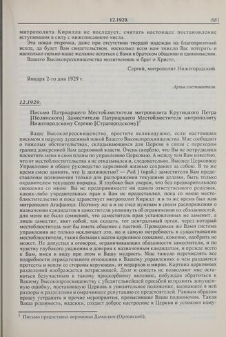 Письмо Патриаршего Местоблюстителя митрополита Крутицкого Петра [Полянского] Заместителю Патриаршего Местоблюстителя митрополиту Нижегородскому Сергию [Страгородскому]. 12.1929 г. // Архив редакции.