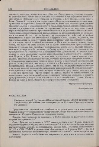 Интервью с главой Патриаршей Православной Церкви в СССР Заместителем Патриаршего Местоблюстителя митрополитом Сергием [Страгородским] и его Синодом. 02(15).02.1930 г. // Известия ЦИК. 1930. № 46 (3893). 16 февр.; Беднота. 1930. № 39. 16 февр.
