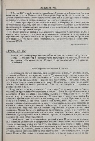 Второе письмо Патриаршего Местоблюстителя митрополита Крутицкого Петра [Полянского] к Заместителю Патриаршего Местоблюстителя митрополиту Нижегородскому Сергию [Страгородскому] (Хэ, Обдорского района). 13(?)(26).02.1930 г.