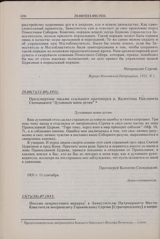Письмо неизвестного иерарха к Заместителю Патриаршего Местоблюстителя митрополиту Горьковскому Сергию [Страгородскому] о вопросах, связанных с порядком местоблюстительства в Православной Русской Церкви. 15(?)(28).07.1933 г.