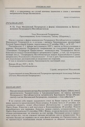 Указ Московской Патриархии о форме поминовения за богослужениями Патриаршего Местоблюстителя. № 52. 7(?)(30).01.1937 г.