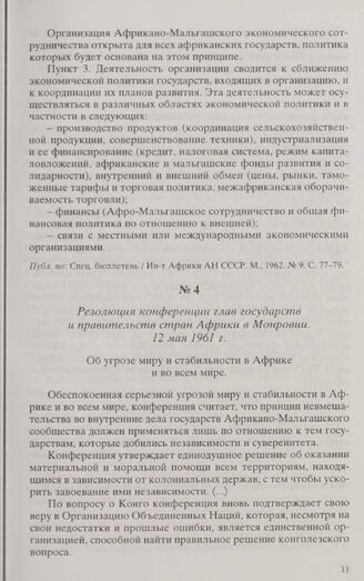 Резолюция конференции глав государств и правительств стран Африки в Монровии. 12 мая 1961 г. // Публ. по: Спец. бюллетень / Ин-т Африки АН СССР. М., 1962. № 9. С. 87-89.