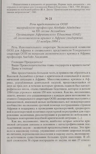 Речь представителя ООН нигерийского профессора Адебайо Адедеджи на XX сессии Ассамблеи Организации Африканского Единства (ОАЕ) об экономическом кризисе в Африке (выдержка). 13 ноября 1984 г. // XX Сессия Ассамблеи глав государств и правительств ОАЕ. Документы и материалы. М., 1985. С. 60-61, 64-65, 69-70, 73.