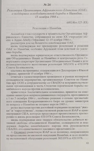 Резолюция Организации Африканского Единства (ОАЕ) о поддержке освободительной борьбы в Намибии. 15 ноября 1984 г. // XX сессия Ассамблеи глав государств и правительств ОАЕ. Документы и материалы. М., 1985. С. 103-106.