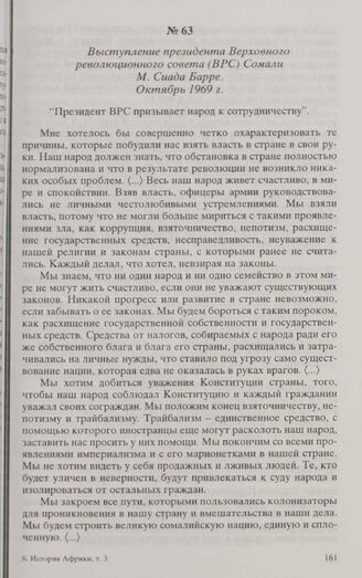 Выступление президента Верховного революционного совета (ВРС) Сомали М. Сиада Барре. Октябрь 1969 г. // «October Star». 1969. 25 okt. Публ. по: Ученые записки Советско-Сомалийской экспедиции. М., 1974. Прил. 2. С. 81, 82.
