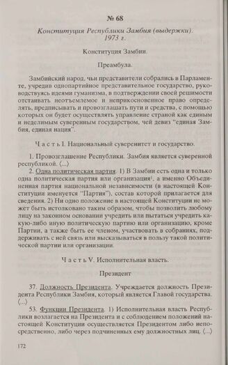 Конституция Республики Замбия (выдержки). 1973 г. // Zambia. Constitution. 1973 // The Constitution of Zambia Act, 1973. Lusaka, 1973. Публ. по: Спец. бюллетень. Программные документы Республики Замбия / Ин-т Африки АН СССР. М., 1978. № 11 (96). С. 3, 4, 44, 57, 63, 85, 86.