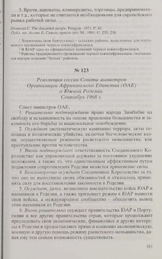 Резолюция сессии Совета министров Организации Африканского Единства (ОАЕ) о Южной Родезии. Сентябрь 1968 г. // ООН. Генеральная Ассамблея. XXIV сессия. Пункты 102 и 23. Доклад Специального комитета по вопросу о ходе осуществления Декларации о предоставлении независимости колониальным странам и народам. Глава VI. Южная Родезия. А(7623). Нью-Йорк, 1967. 23 февр. С. 53-55.