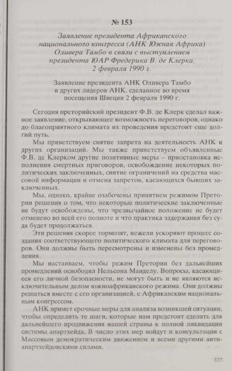 Заявление президента Африканского национального конгресса (АНК Южная Африка) Оливера Тамбо в связи с выступлением президента ЮАР Фредерика В. де Клерка. 2 февраля 1990 г.