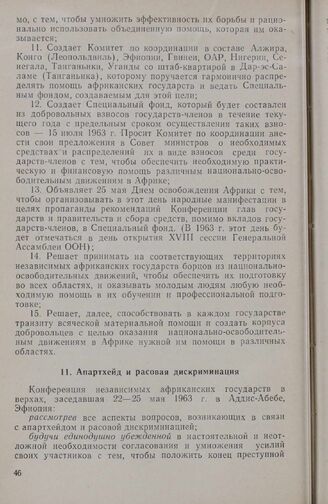 Учредительная конференция ОАЕ (Третья конференция независимых государств Африки). Апартхейд и расовая дискриминация. Аддис-Абеба, 22-25 мая 1963 г. // «OAU, Basic Documents and Resolutions Provisional Secretariat», Addis Ababa, 1964.