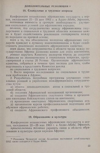 Учредительная конференция ОАЕ (Третья конференция независимых государств Африки). Дополнительные резолюции. Социальные и трудовые вопросы. Аддис-Абеба, 22-25 мая 1963 г. // «OAU, Basic Documents and Resolutions Provisional Secretariat», Addis Ababa, 1964.