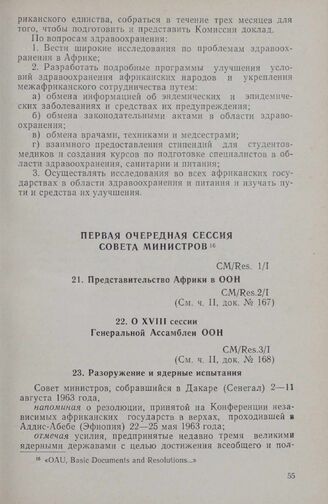 Первая очередная сессия Совета министров. CM/Res.2/I. О XVIII сессии Генеральной Ассамблеи ООН. Дакар, 2-11 августа 1963 г. // «OAU, Basic Documents and Resolutions Provisional Secretariat», Addis Ababa, 1964.