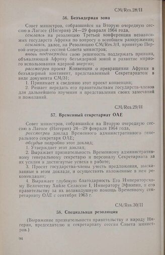 Вторая очередная сессия Совета министров. CM/Res.29/II. Временный секретариат ОАЕ. Лагос, 24-29 февраля 1964 г. // «OAU, Basic Documents and Resolutions Provisional Secretariat», Addis Ababa, 1964.