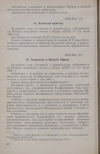 Первая очередная сессия Ассамблеи глав государств и правительств. AHG/Res. 5/I. Апартхейд в Южной Африке. Каир, 17-21 июля 1964 г. // «OAU, Resolutions and Recommendations of the First Session of the Assembly of Heads of State and Government and Third Session of the Council of Ministers, Provisional Secretariat», Addis Ababa, 1964.