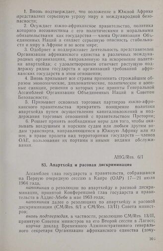 Первая очередная сессия Ассамблеи глав государств и правительств. AHG/Res. 6/I. Апартхейд и расовая дискриминация. Каир, 17-21 июля 1964 г. // «OAU, Resolutions and Recommendations of the First Session of the Assembly of Heads of State and Government and Third Session of the Council of Ministers, Provisional Secretariat», Addis Ababa, 1964.