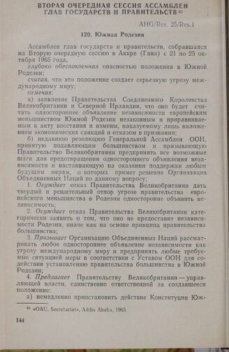 Вторая очередная сессия Ассамблеи глав государств и правительств. AHG/Res.25/Res.l. Южная Родезия. Аккра, 21-25 октября 1965 г. // «OAU, Secretariat», Addis Ababa, 1965.
