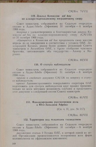 Седьмая очередная сессия Совета министров. CM/Res. 80/VII. О статусе наблюдателя. Аддис-Абеба. 31 октября-6 ноября 1966 г. // «OAU, Secretariat», Addis Ababa, 1966.