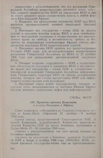 Седьмая очередная сессия Совета министров. CM/Res. 88/VII. Принятие проекта Конвенции о статусе беженцев в Африке. Аддис-Абеба. 31 октября-6 ноября 1966 г. // «OAU, Secretariat», Addis Ababa, 1966.