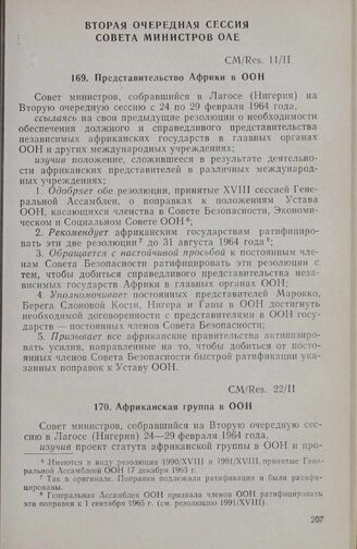 Вторая очередная сессия Совета министров ОАЕ. CM/Res. 22/II. Африканская группа в ООН. Лагос, 24-29 февраля 1964 г.