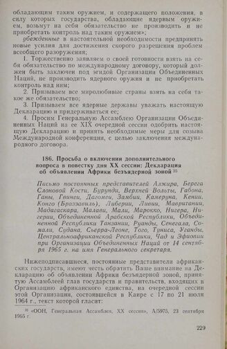 Просьба о включении дополнительного вопроса в повестку дня XX сессии: Декларация об объявлении Африки безъядерной зоной. 14 сентября 1965 г. // «ООН, Генеральная Ассамблея, XX сессия», А/5975, 23 сентября 1965 г.
