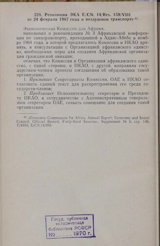 Международная Организация Гражданской Авиации (ИКАО). Резолюция ЭКА E/CN. 14/Res. 159/VIII от 24 февраля 1967 года о воздушном транспорте
