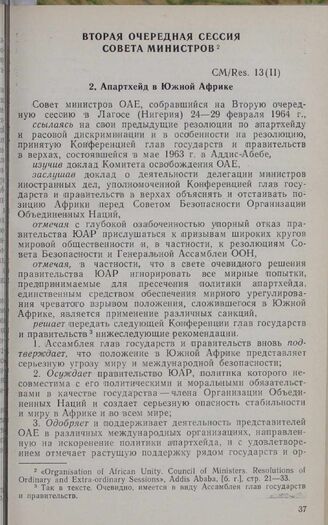 Вторая очередная сессия Совета министров. CM/Res. 13(II). Апартхейд в Южной Африке. Лагос, 24-29 февраля 1964 г. // «Organisation of African Unity. Council of Ministers. Resolutions of Ordinary and Extra-ordinary Sessions», Addis Ababa, [б. г.], стр. 21-33.