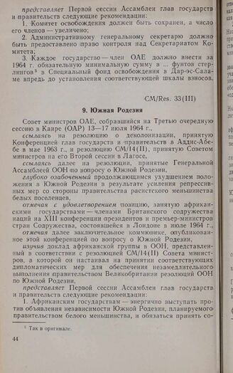 Третья очередная сессия Совета министров. CM/Res. 33(III). Южная Родезия. Каир, 13-17 июля 1964 г. // «Organisation of African Unity. Council of Ministers. Resolutions of Ordinary and Extra-ordinary Sessions», стр. 35-48.