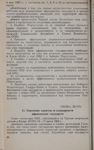 Третья очередная сессия Совета министров. CM/Res. 35(III). Упрочение единства и солидарности африканских государств. Каир, 13-17 июля 1964 г.