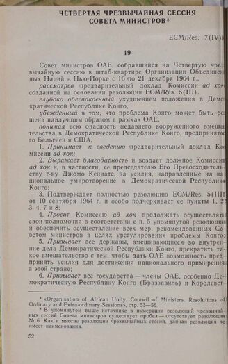 Четвертая чрезвычайная сессия Совета министров. ECM/Res. 7(IV). Нью-Йорк, 16-21 декабря 1964 г. // «Organisation of African Unity. Council of Ministers. Resolutions of Ordinary and Extra-ordinary Sessions», стр. 53-56.