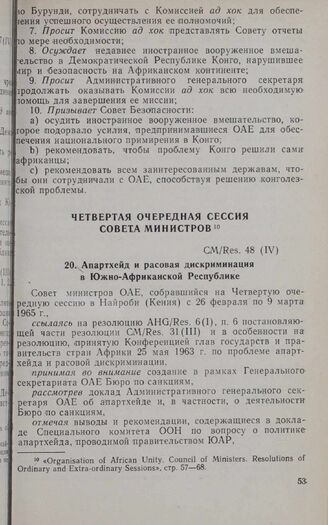 Четвертая очередная сессия Совета министров. CM/Res. 48 (IV). Апартхейд и расовая дискриминация в Южно-Африканской Республике. Найроби, 26 февраля-9 марта 1965 г. // «Organisation of African Unity. Council of Ministers. Resolutions of Ordinary and Extra-ordinary Sessions», стр. 57-68.