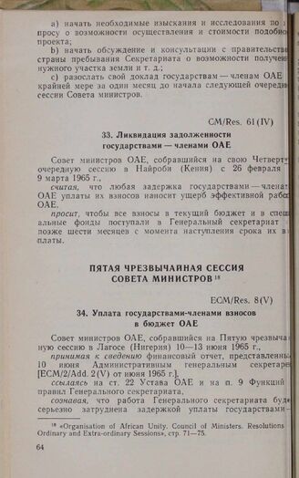Четвертая очередная сессия Совета министров. СM/Res. 61(IV). Ликвидация задолженности государствами — членами ОАЕ. Найроби, 26 февраля-9 марта 1965 г. // «Organisation of African Unity. Council of Ministers. Resolutions of Ordinary and Extra-ordinary Sessions», стр. 57-68.