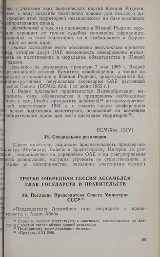 Третья очередная сессия Ассамблеи глав государств и правительств. Послание Председателя Совета Министров СССР. Аддис-Абеба, 5-9 ноября 1966 г. // «Правда», 6.ХІ.1966.