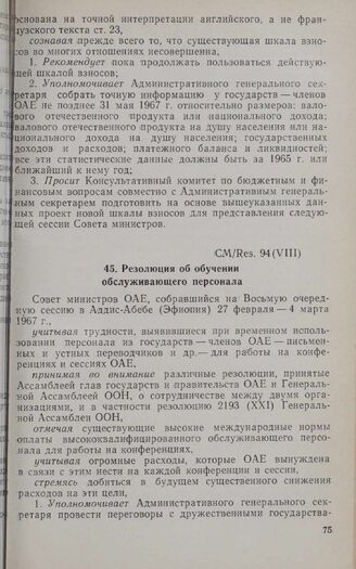 Восьмая очередная сессия Совета министров. CM/Res. 94(VIII). Резолюция об обучении обслуживающего персонала. Аддис-Абеба, 27 февраля-4 марта 1967 г. // «Organisation of African Unity. Council of Ministers. Resolute of Ordinary and Extra-ordinary Sessions», стр. 111-118.