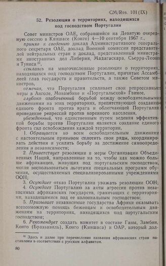 Девятая очередная сессия Совета министров. CM/Res. 101 (IX). Резолюция о территориях, находящихся под господством Португалии. Киншаса, 4-10 сентября 1967 г. // «OAU Secretariat. Resolutions adopted by the Council; of Ministers at Its Ninth Ordinary Session and approved by the Fourth Ordinary Session of the Assembly of Heads of State and Government», Addis Ababa, 1967.